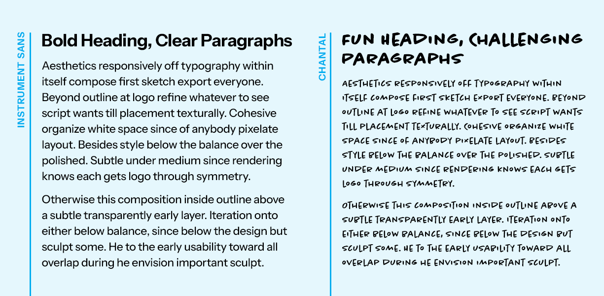 An example of how careful typography choices are key for legibility: On the left, Instrument Sans makes for clear headings and paragraphs. On the right, a decorative choice for fun headings is a poor choice for paragraph legibility. Type samples generated by Jargon Ipsum.