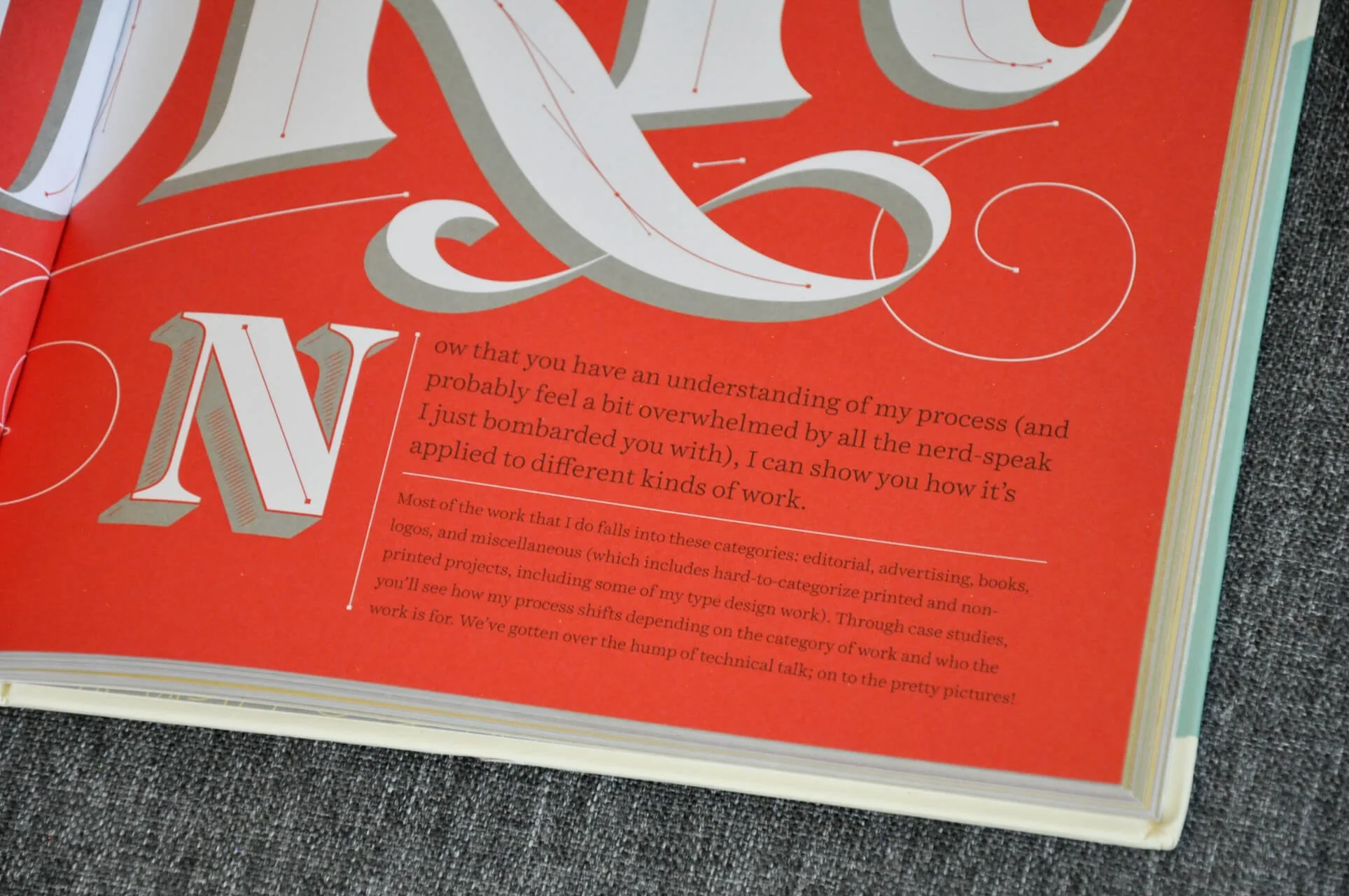 As the narrative rolls on, you’ll find that each section opening page is set in what I’ve come to know as Hische’s signature look: A blend of typography styles (script, serif, sans serif), careful linework and spacing, and a mix of subtle and bold colors. It’s fun and professional—a style that conveys approachability without going overboard in playfulness.