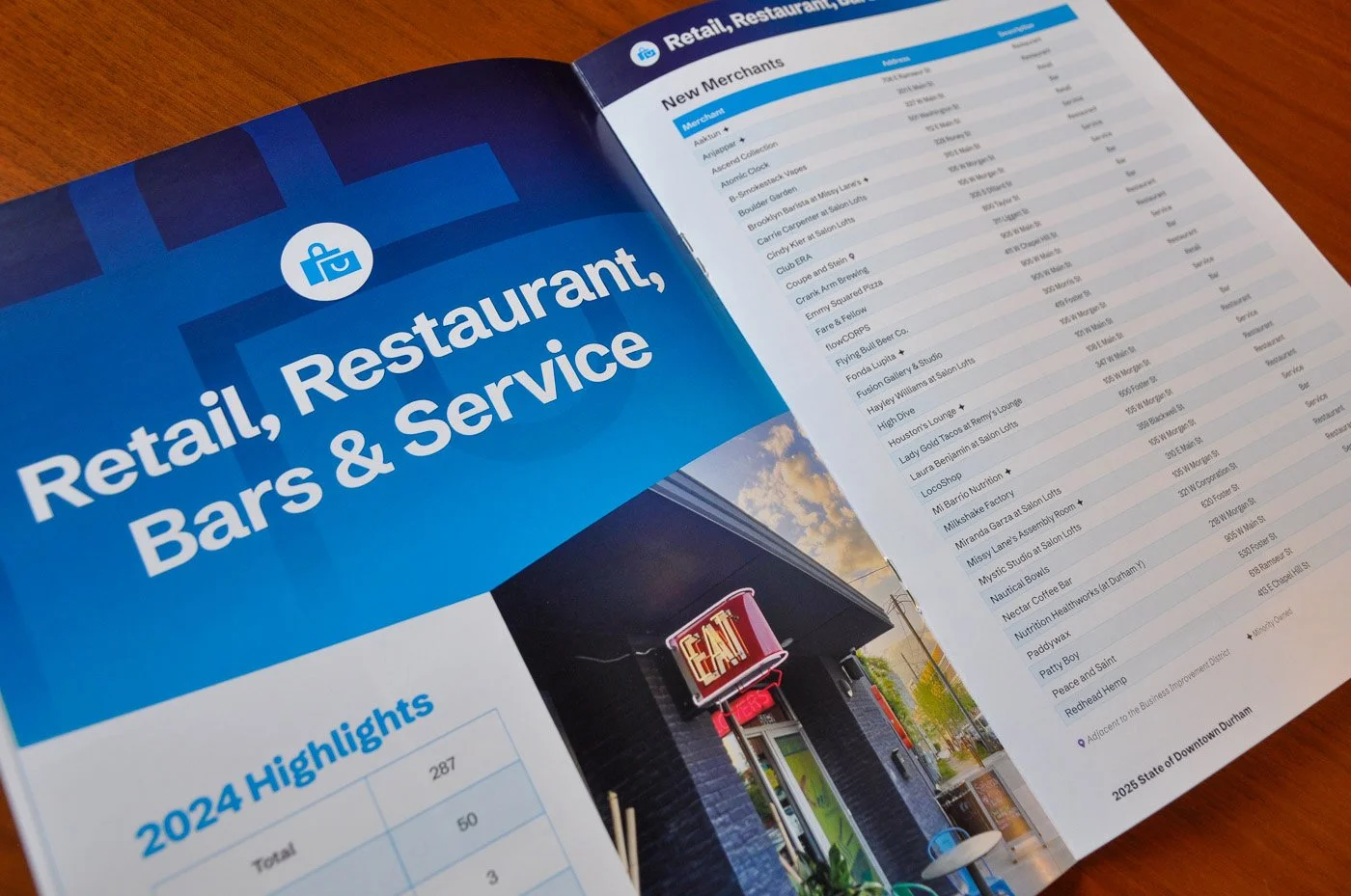 Our team’s collaborations with Downtown Durham Inc’s (DDI) reports go back a long way—from the 2015 Welcome to Your Downtown piece to 2021’s State of Downtown Durham (SoDD) Report to new 2025 Quarterly Reports and more. For this year’s SoDD meeting, they tasked us with refreshing the template branding and creating a new print piece for the event. As always, we were up to the challenge.