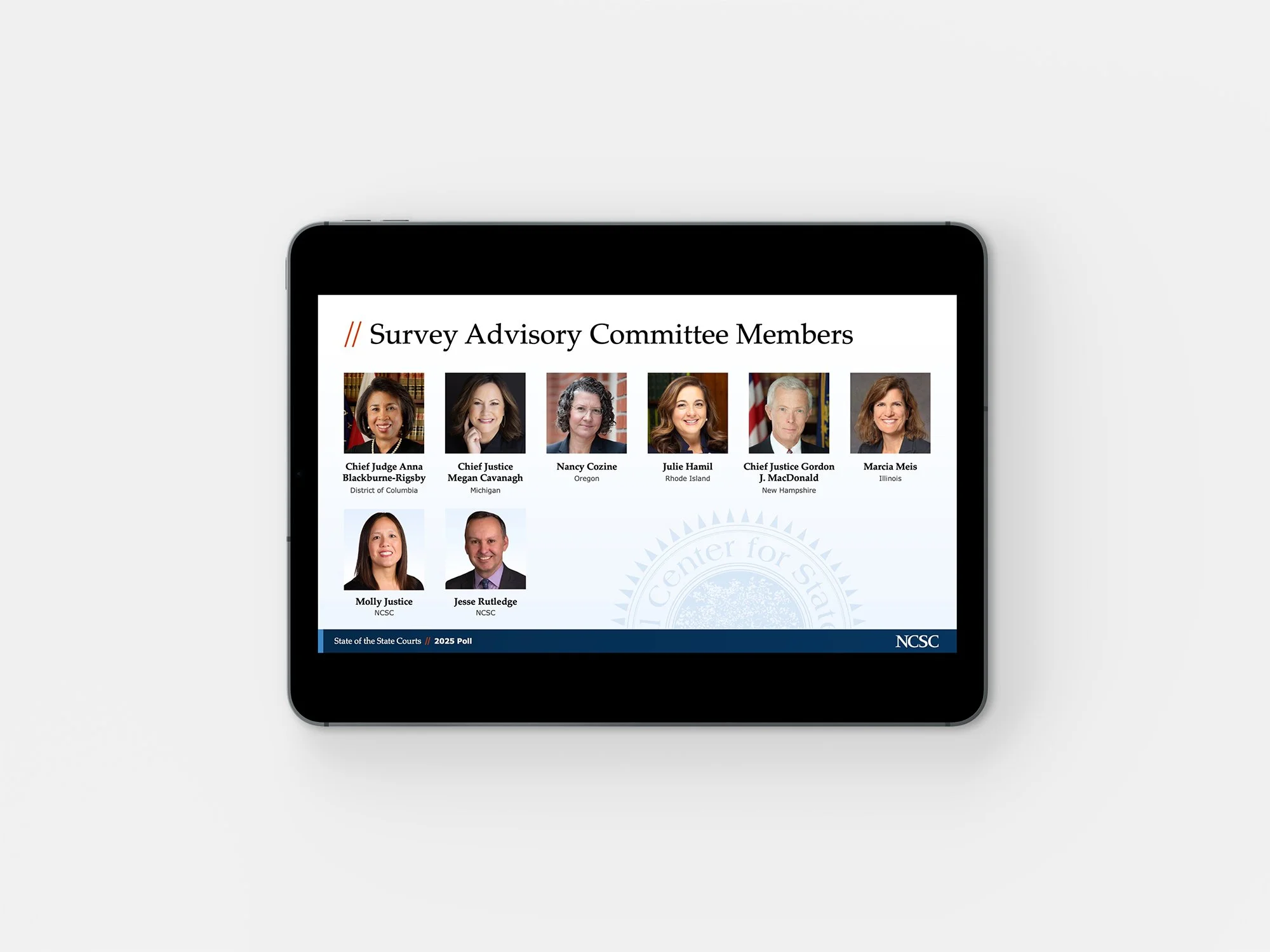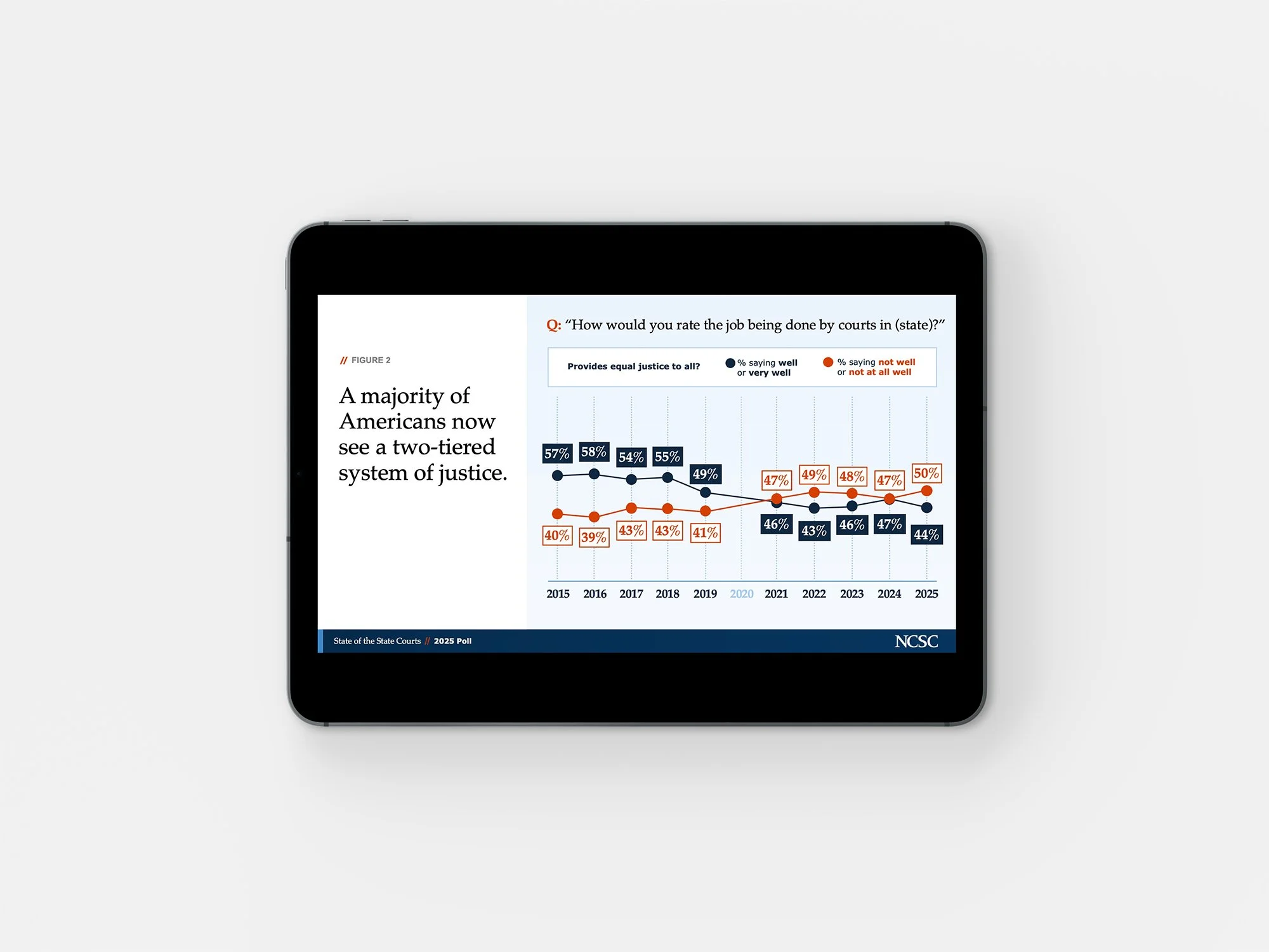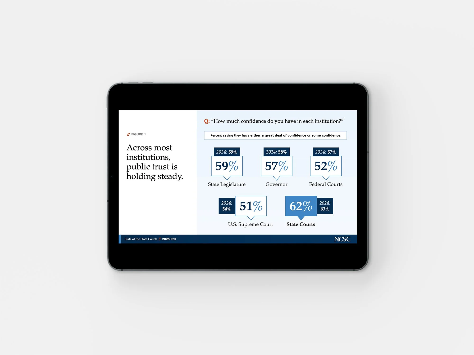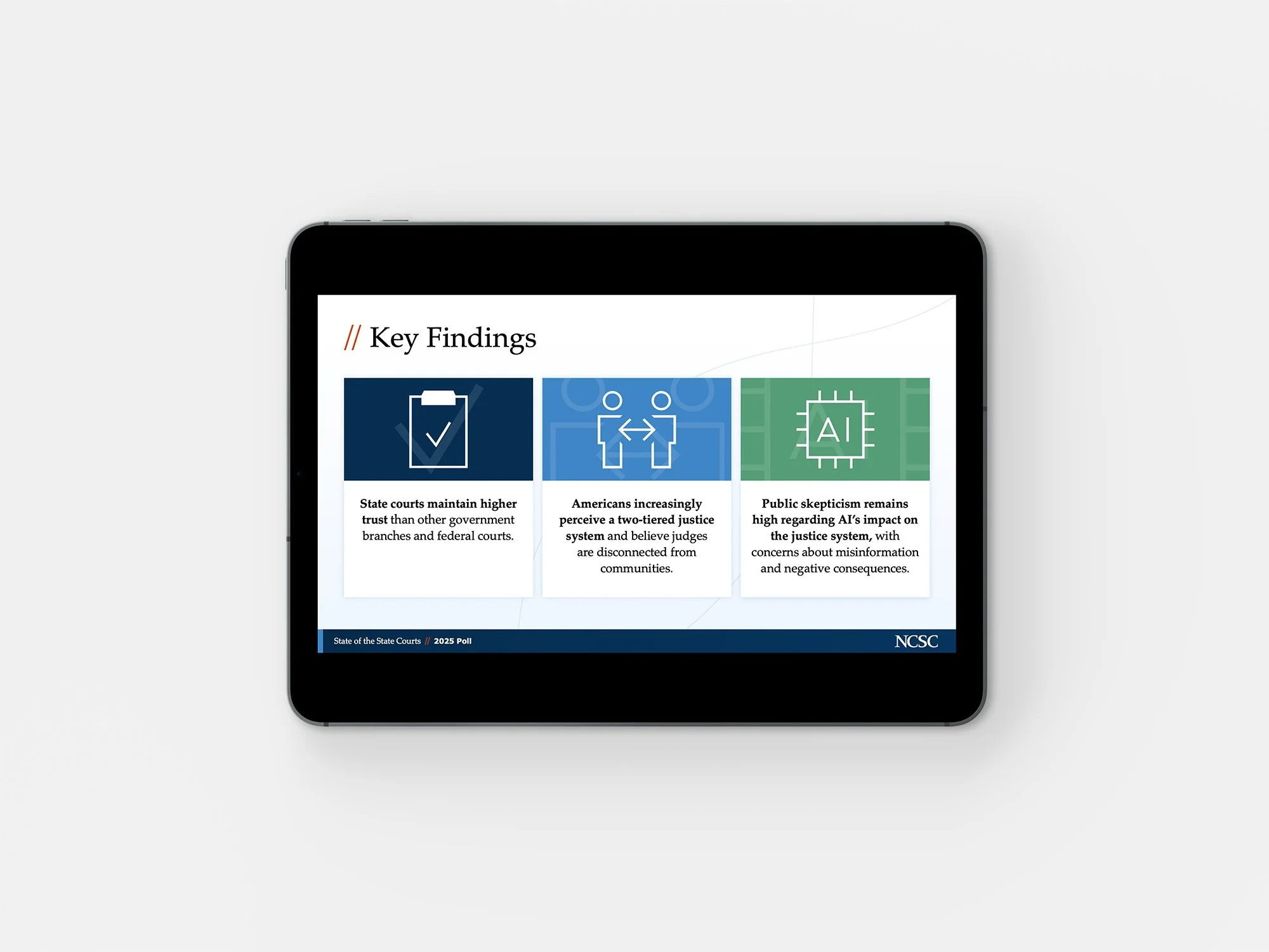 In 2025, the National Center for State Courts (NCSC) launched all new brand styles, and that meant it was time for the State of the State Courts presentation to get a visual overhaul to match. After a thorough review of the brand guidelines and new graphic assets, we were confident we could rework the presentation to fit into the new NCSC-style family—all without losing the State of the State Courts brand equity we’d built over the years.